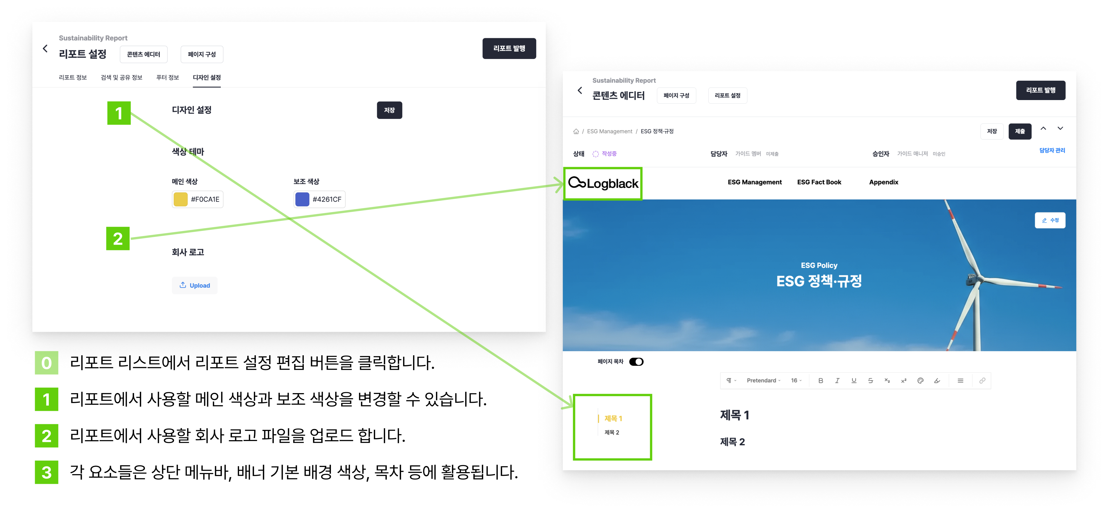 리포트 설정 페이지에서 리포트 디자인 설정을 편집할 수 있습니다.