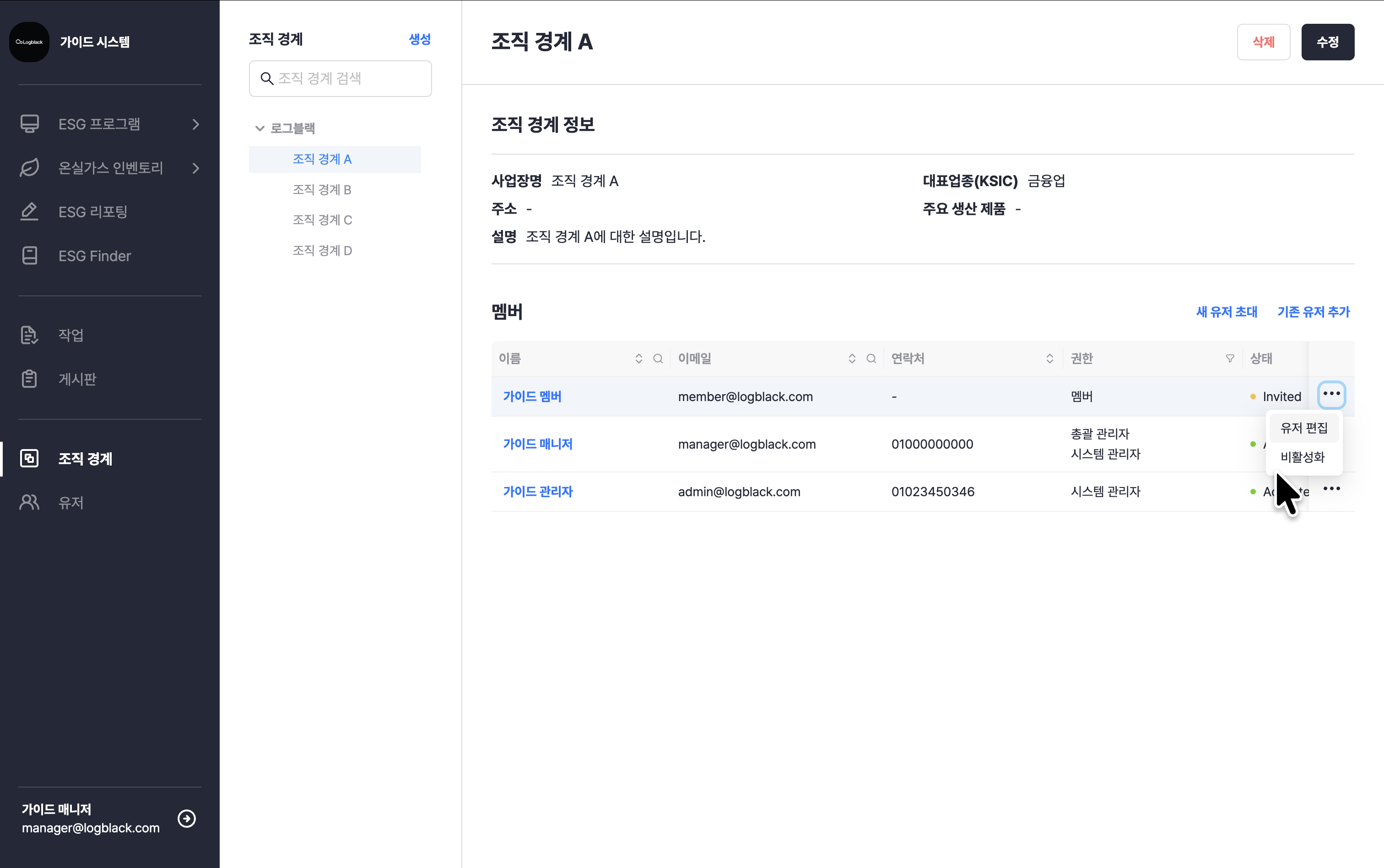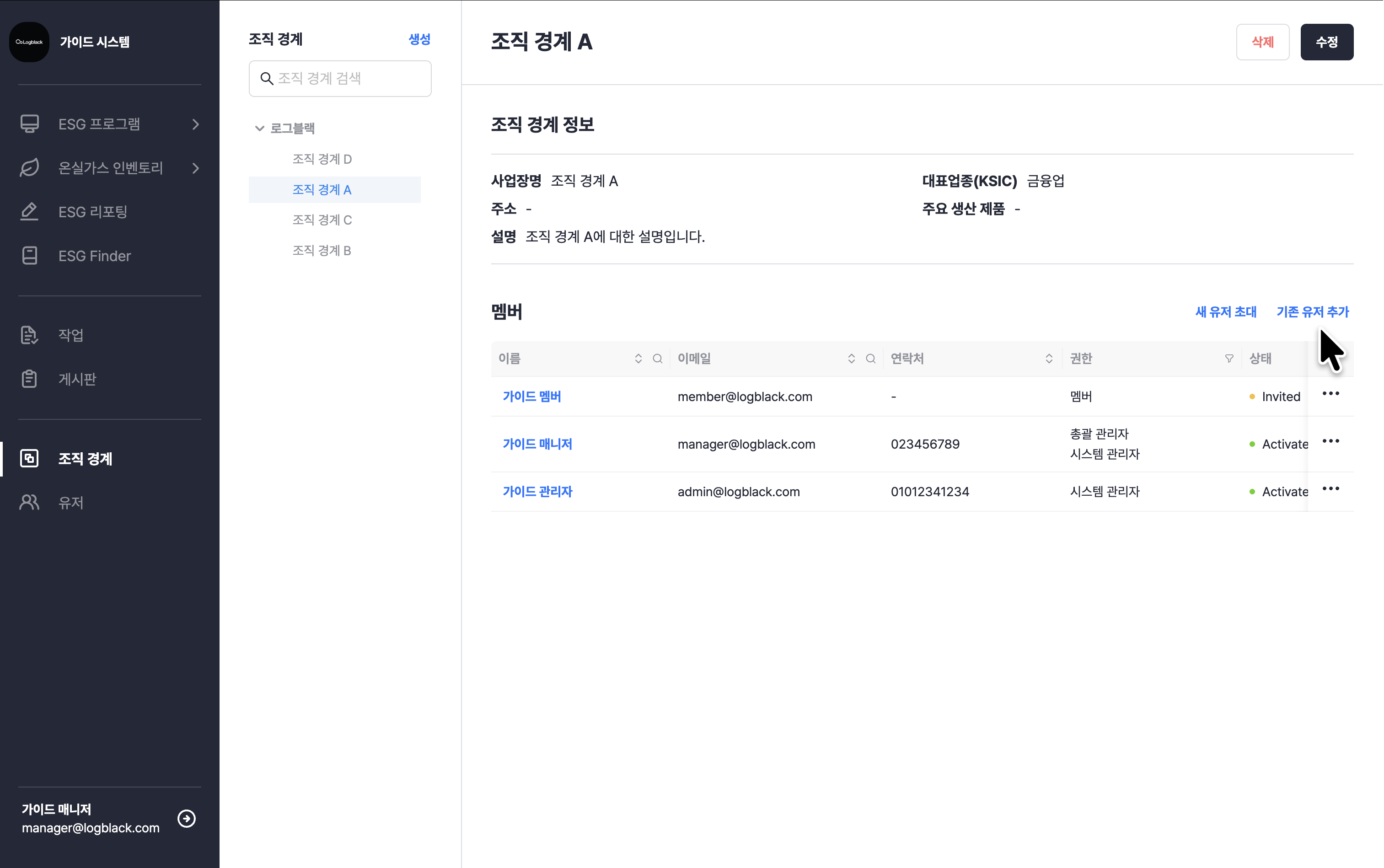 • 조직 경계 관리자: 소속된 사업장에 대한 관리자 권한으로, 소속 사업장의 유저를 관리할 수 있습니다.