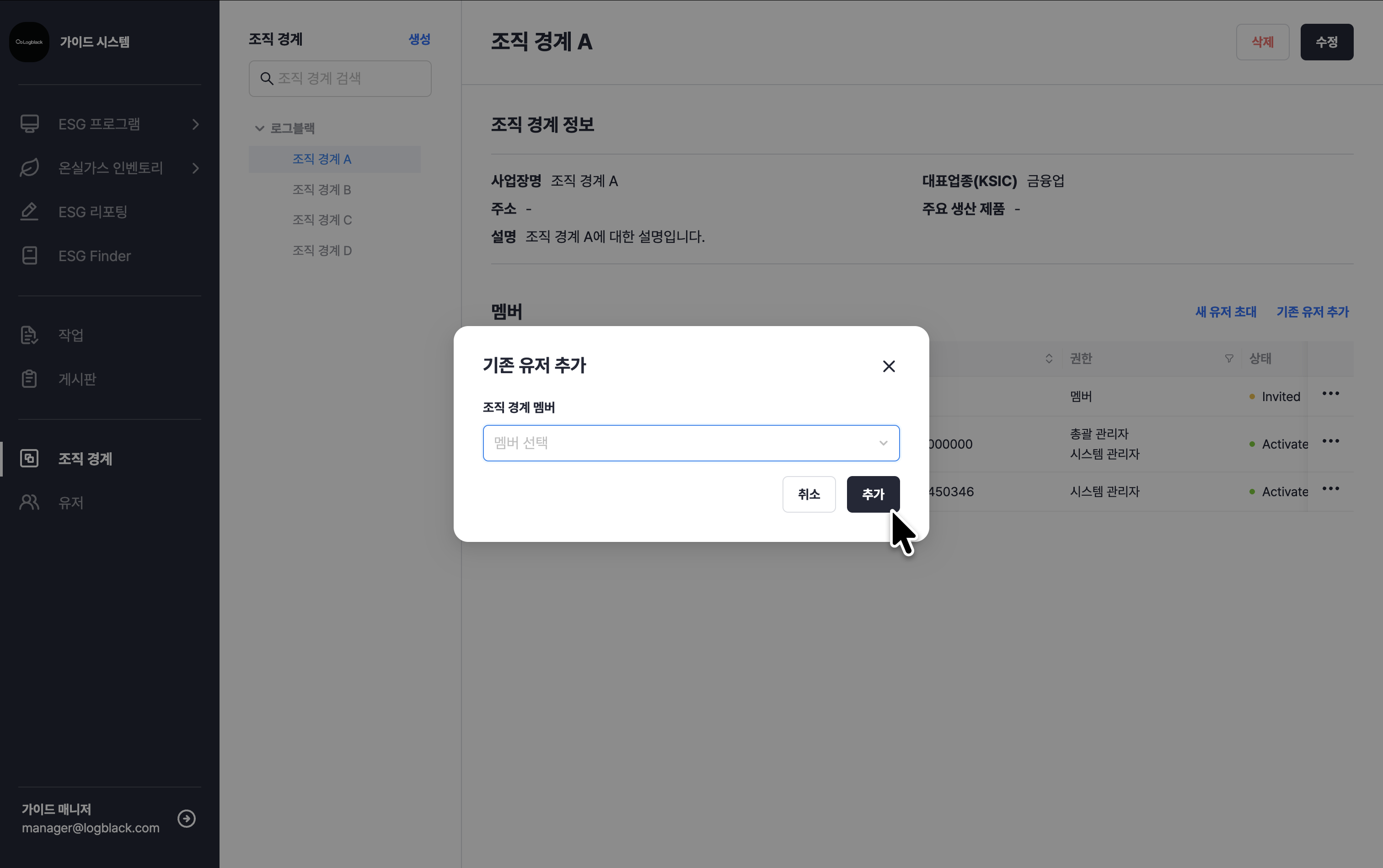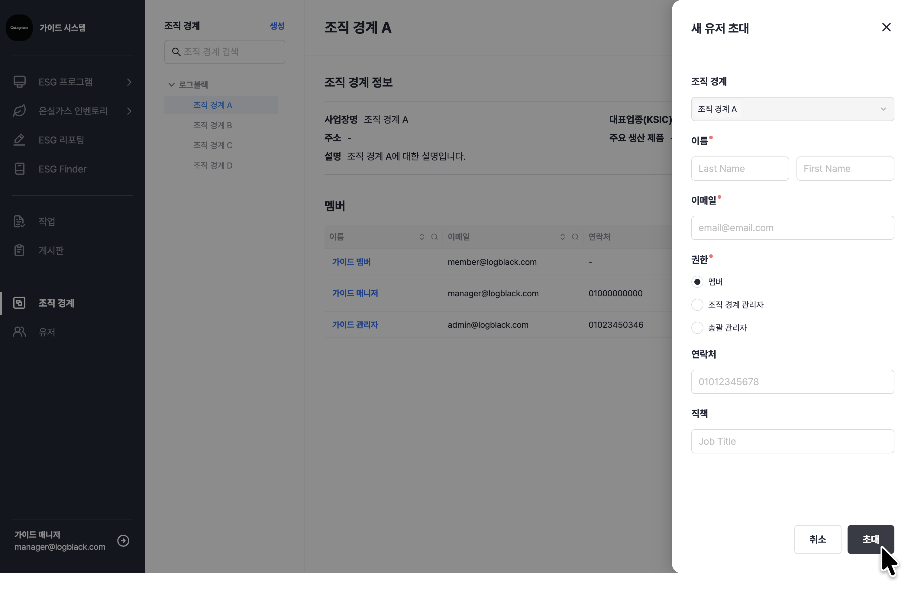 • 권한: 멤버, 조직 경계 관리자, 총괄 관리자 중 선택합니다.