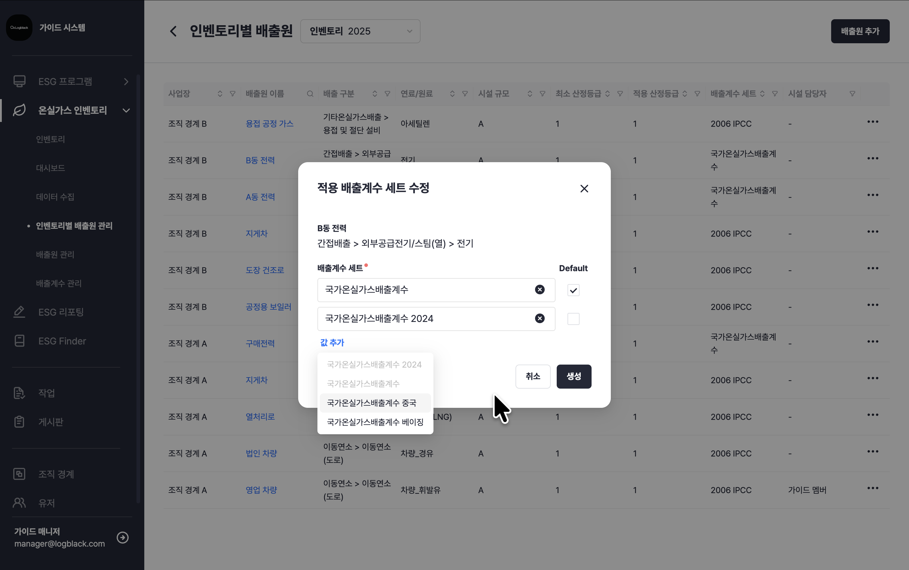 온실가스 인벤토리 > 인벤토리별 배출원 > 적용 배출계수 세트 수정