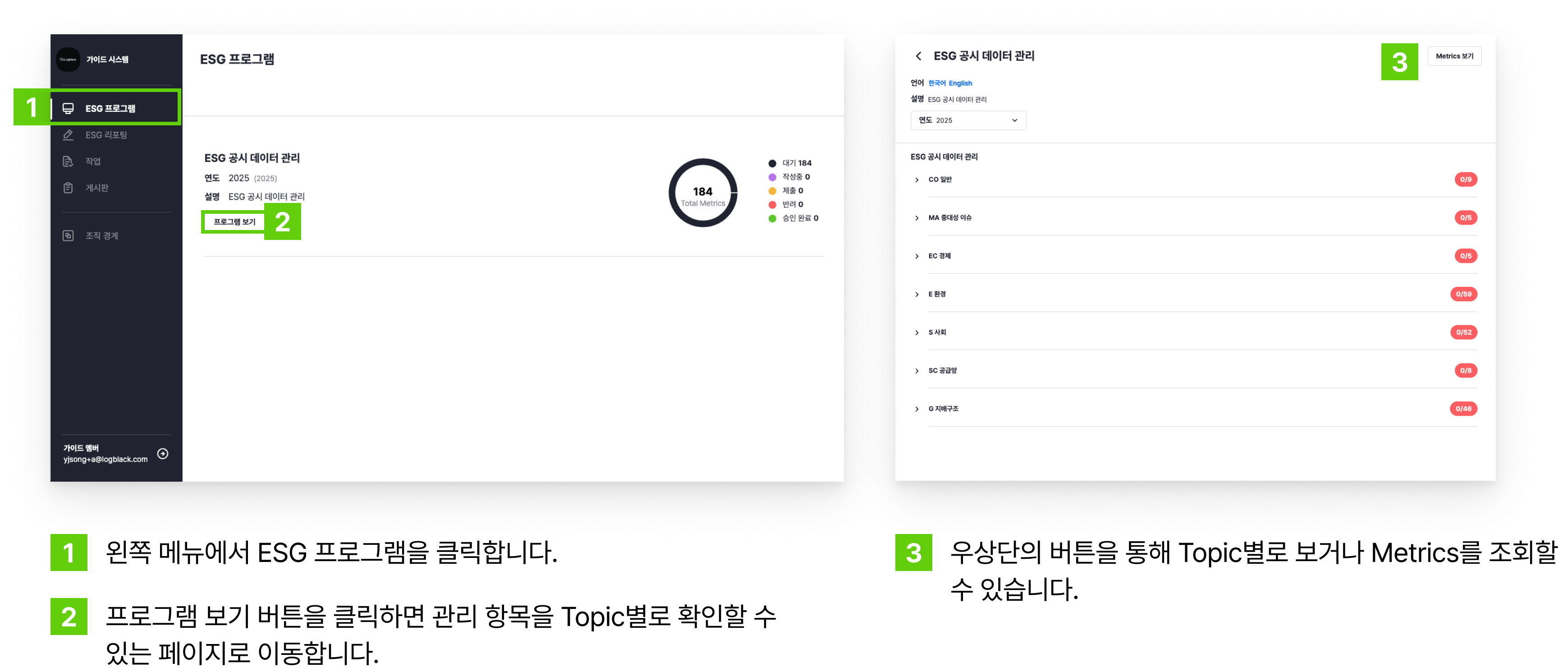 내 사업장에서 관리하는 ESG 관련 주제 및 지표들을 확인할 수 있습니다.