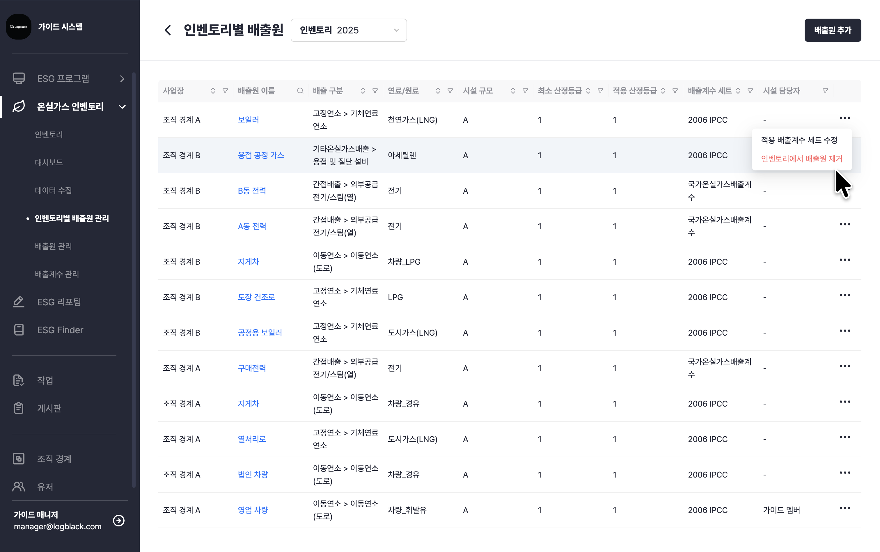 온실가스 인벤토리 > 인벤토리별 배출원 관리